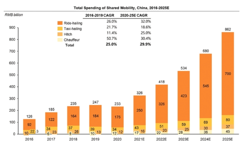 CIC에 따르면, 중국의 공유 모빌리티 시장은 2020년부터 2025년까지 기준, 연평균 29.9%의 성장률을 보일 것으로 예상된다. 중국뿐만 아니라 중동과 아프리카 또한 연평균 23.7%의 가파른 성장률이 예상된다. 이처럼 공유 모빌리티가 하나의 커다란 트렌드로 자리 잡힌 상황 속에서 디디추싱은 중국의 승차 공유 시장을 장악하고 있는 것이다.