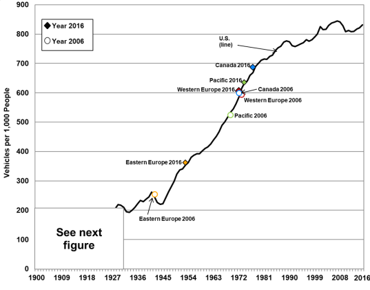 하지만 중국의 경우 여전히 인구당 자동차 소유 비율이 15% 수준에 머물러 있다. 아래 통계 자료는 Green Car Gongress가 2018년에 발표한 자료로, 미국을 기준으로 각국의 자동차 소유 비율을 나타내고 있다. 2016년 기준 중국은 인구 1000명당 150대 이하의 자동차를 소유하며 1923년 미국의 인당 자동차 소유율과 비슷한 수준을 나타냈다.