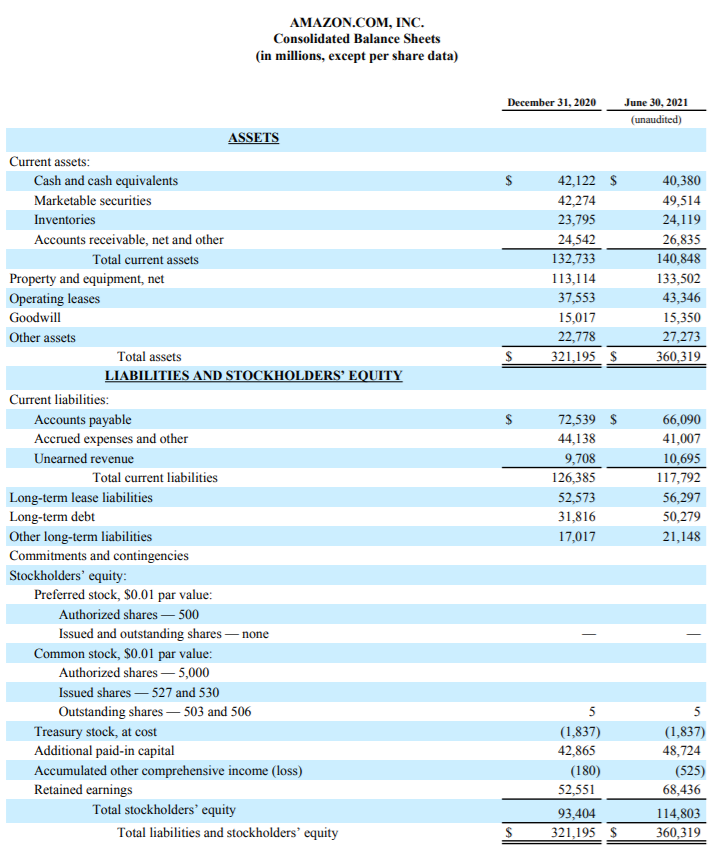 다음은 아마존의 대차대조표이다. 2021년 6월 기준 아마존의 총자산은 $360.3B이며 총부채는 $245.51B이다. 따라서 총자본(=Equity)은 $114.8B-$245.51B=$114.8B이며 이에 따라 총부채율은 213.8%이다. 그리고 총자산 대비 부채비율은 68.1%이며 전년의 70.92%보다 약간 감소한 점을 알 수 있다. 현재 아마존의 부채율은 타 빅테크 대비 상당히 높다고 볼 수 있지만, 이는 아마존이 지향하는 성장과 공격적인 투자라는 방향성에 따라 어느 정도 용인할 수 있다고 본다.